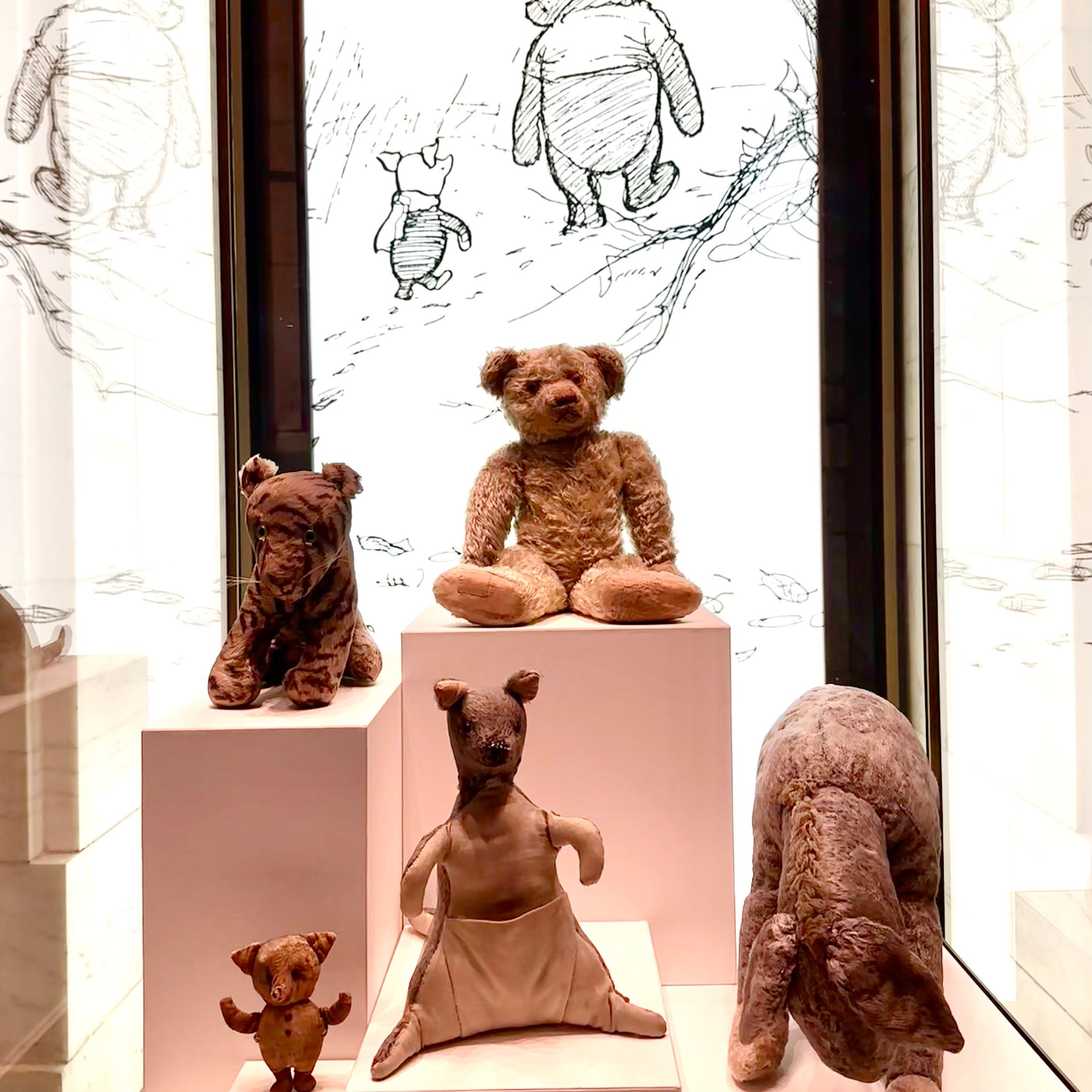 A library is a wonderful place simply because it houses a vast collection of books, but the New York Public Library has many other special items to boast about in the display cabinets of the Polonsky Exhibition. With exhibits ranging from the Gutenberg Bible to miniature books and a section of a musical manuscript by Mozart, there is much to linger over and enthuse about. One of my favourite exhibits is the family of stuffed toys that inspired the cuddly creatures of Hundred Acre Wood. The lovely bear from the Harrods department store was a gift for Christopher Robin Milne on the occasion of his first birthday. Christopher Robin named his bear Edward, but changed the name to Winnie after several visits to see a Canadian black bear named Winnie at London Zoo. A friend had a pet swan named Pooh which inspired the bear's change of name to Winnie-the-Pooh. The bear gained worldwide fame from the tales and poems A.A. Milne wrote about him and his adorable stuffed toy companions: Piglet, Tigger, Eeyore, Kanga and Roo. Little Roo lost his way in an apple orchard in the 1930s, never to be seen again, but the other toys travelled to the United States in 1947, and have remained there ever since. Milne’s American publisher donated them to the Library in 1987. It's always fascinating to discover the inspirations behind authors' tales, and it's especially thrilling to be able to stand so close and admire them in all their glory!